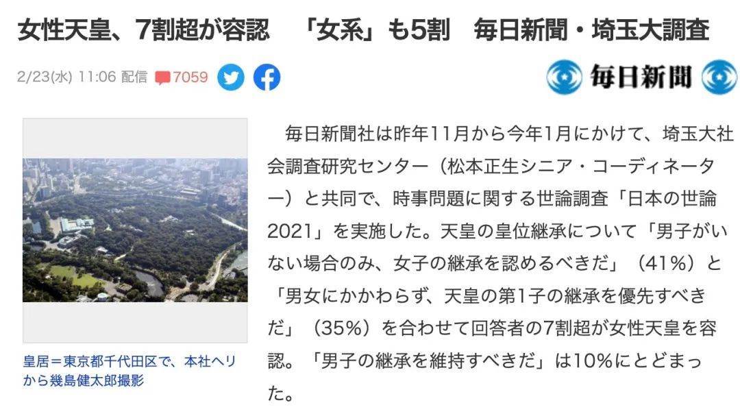 另一方面,日本每日新聞與琦玉大學社會研究中心合作,關于皇位繼承問題進行民意調查,對日本全國 240 個地區的民眾進行隨機抽樣。關于女性繼承天皇,有70%以上的投票者接受表示接受。只有10%的人表示「應該保留男性繼承天皇」。