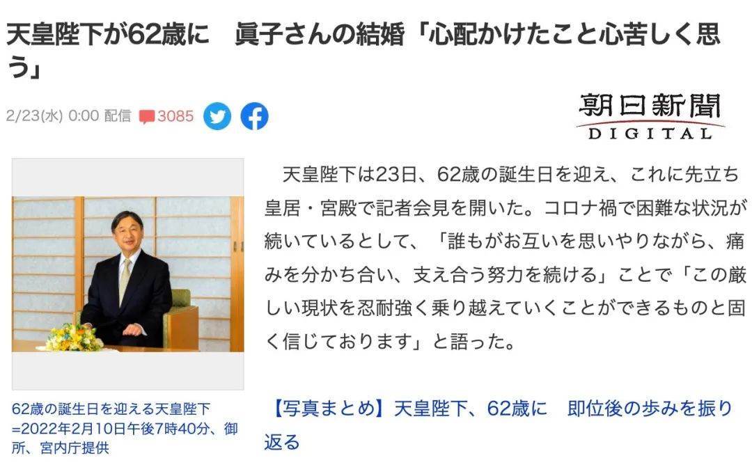 根據日本朝日新聞報導,日本天皇德仁今日迎來他的62歲生日,並在皇居舉辦了記者招待會,在新冠疫情持續的社會狀態下,他表示:「希望大家相互關心,互相支援,堅信可以克服目前這種嚴峻的局面。」